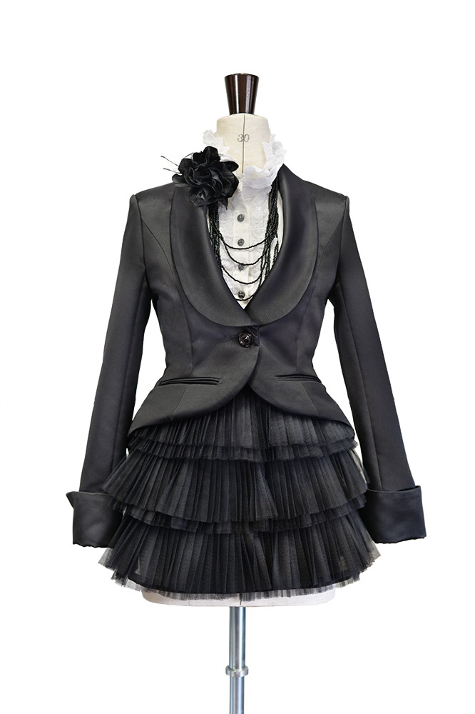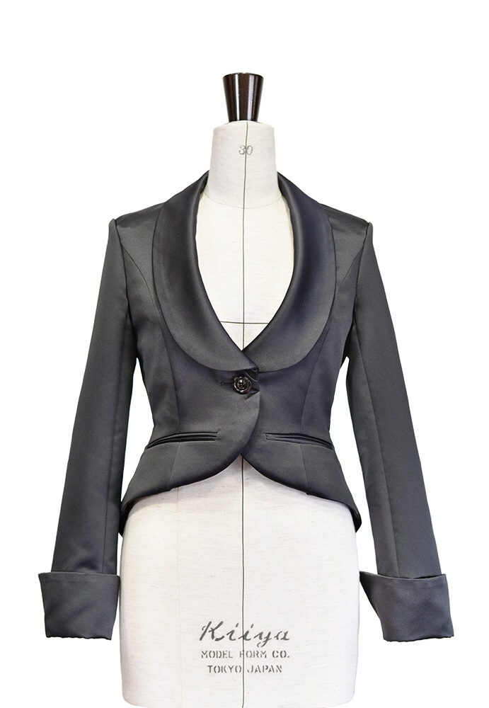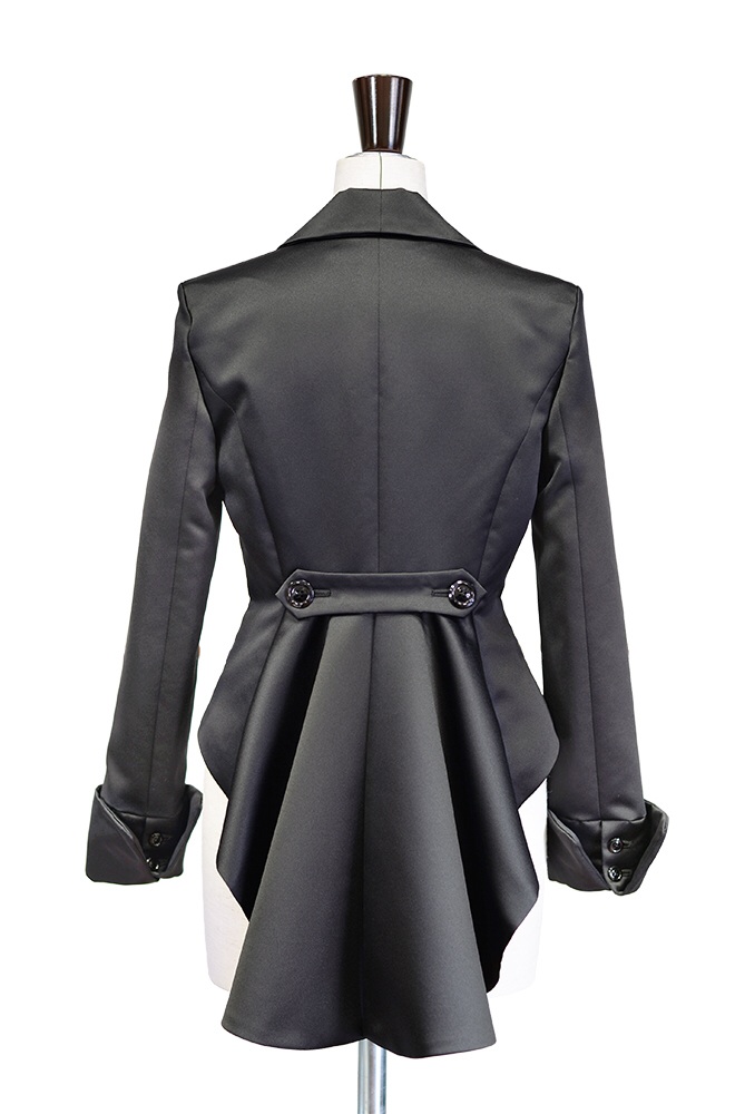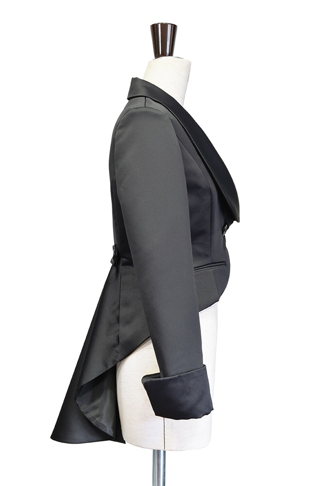 ジャケットは上質なサテン地を使用したショールカラーのフォーマルなデザインで、後ろ裾がフラットなタイプと燕尾タイプの2種類を作りました。
