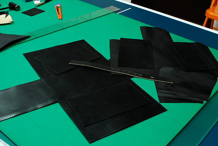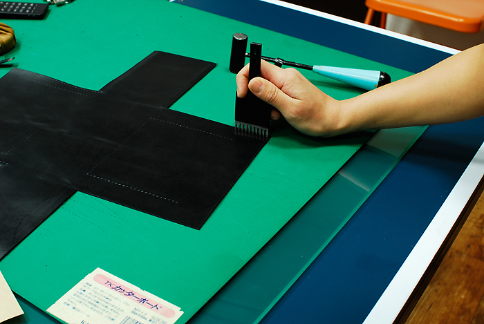 裁断し終わった革は、写真のように穴あけの作業をして行くのですが、