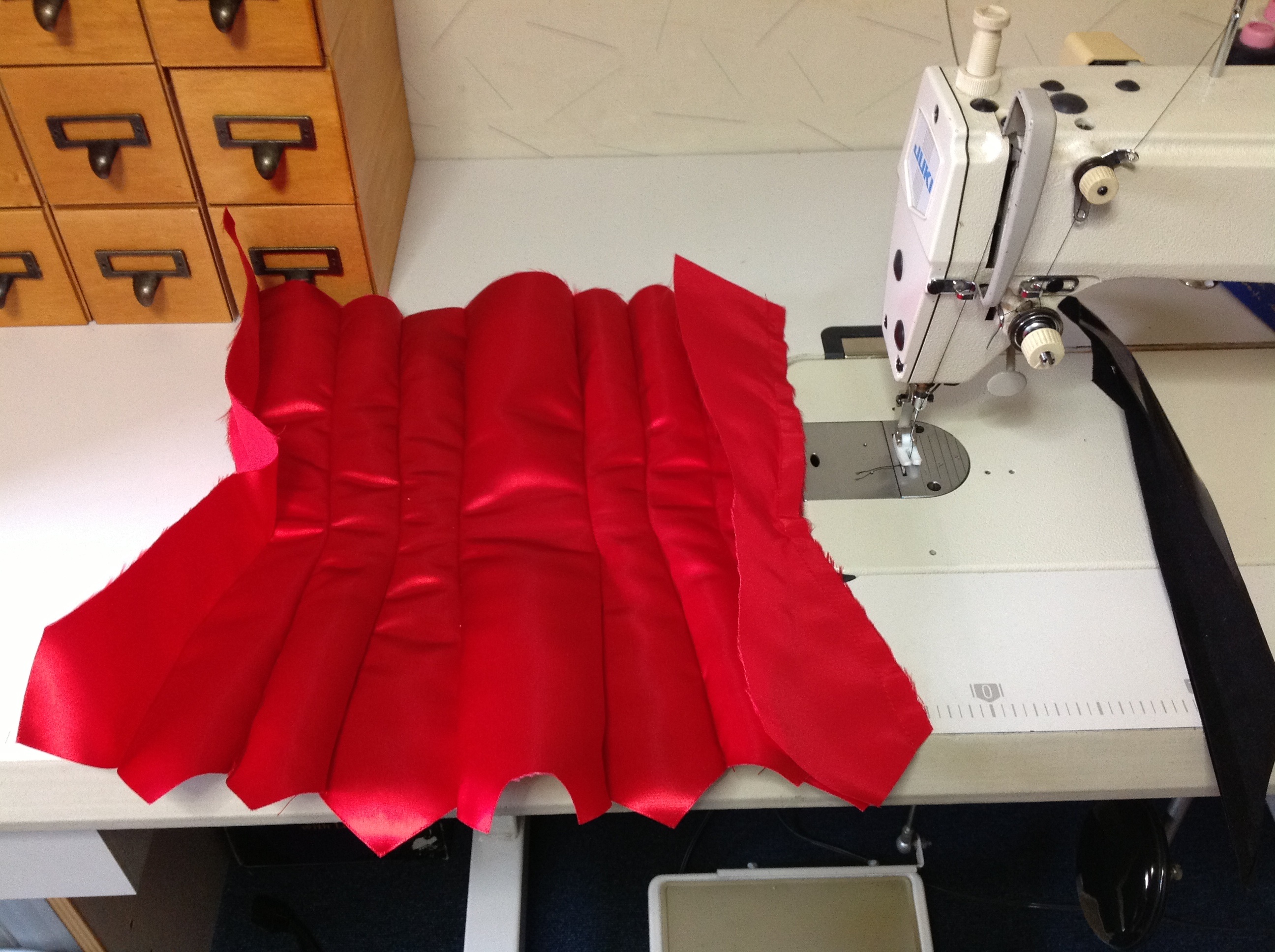 こういう風に。 あとは、裾全体を始末して、胸元をパイピングして完了です。