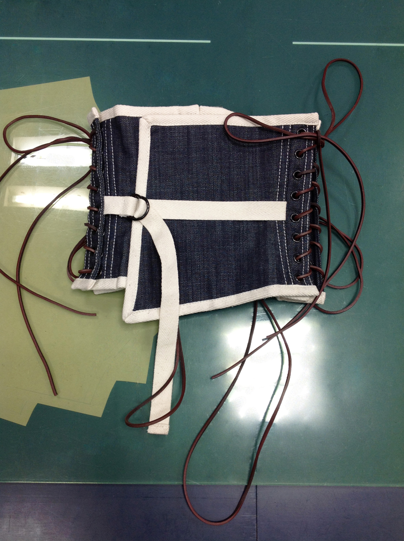 前中心身頃に編み上げ状に革テープを縫い付けます。