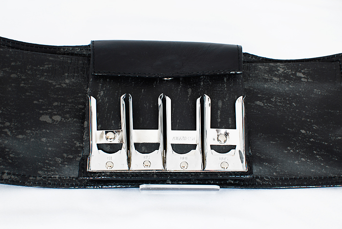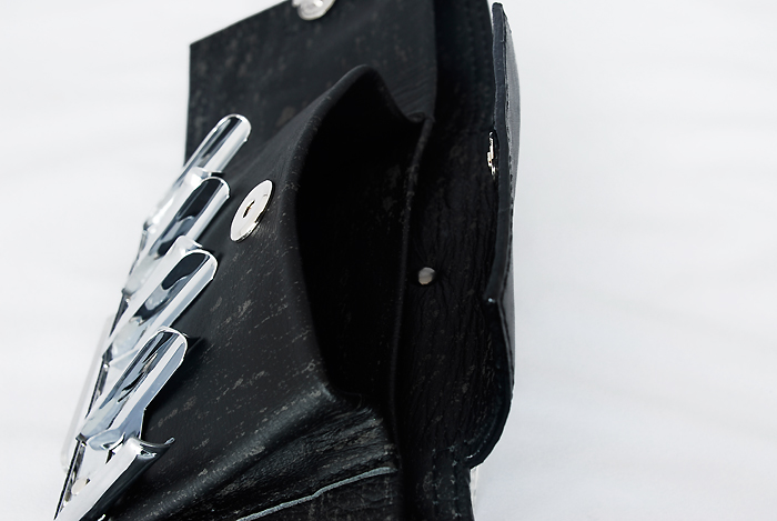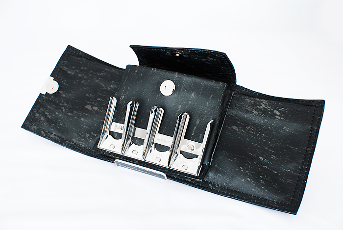 これも、プラスチックの厚紙に革を巻いて底板にするという