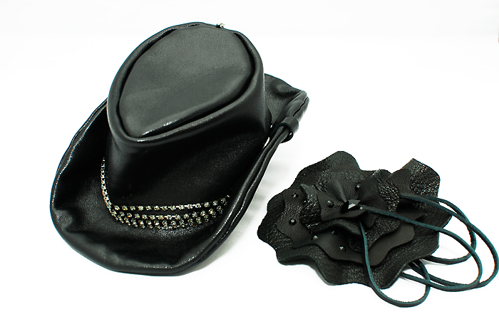 ミニサイズのテンガロンに革のフリルコサージュを