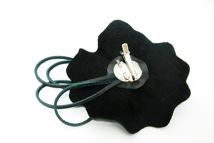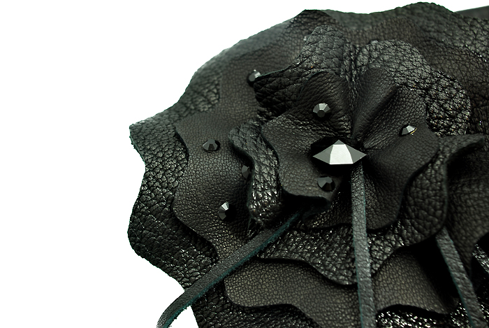 コサージュは2種類の牛革を使い、フリルカット+ギャザーでボリュームたっぷりに。